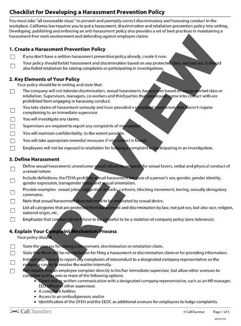 Use this checklist to develop and enforce your harassment prevention policy to maintain a harassment-free work environment. A written harassment, discrimination and retaliation prevention policy is required for California employers​​. (Formerly Checklist for Developing a Sexual Harassment Policy)​​​​​